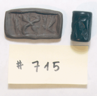 ca. 2700 B.C. This very early example of a cylinder seal shows one of the common scenes depicted on them. Here can be seenan ancient 'hero' doing battle with some fantastic creatures. Such seals were commonly worn around the neck with a string drawn though the hole bored through the length of the seal. See clay impression made from the seal.